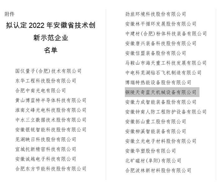 据悉:在日前安徽省经济和信息化厅公示的“关于2022年安徽省技术创新示范企业拟认定名单”中,铜陵天奇蓝天名列其中。此次荣获该荣誉,是对公司前期技术创新工作的肯定和褒奖。同时也将激励我们紧盯行业前沿技术,不断加大团队建设和资金投入以提升公司的核心竞争力及市场影响力。促进持续发展,推动科学技术进步,力争我司在技术创新领域取得更大成果。